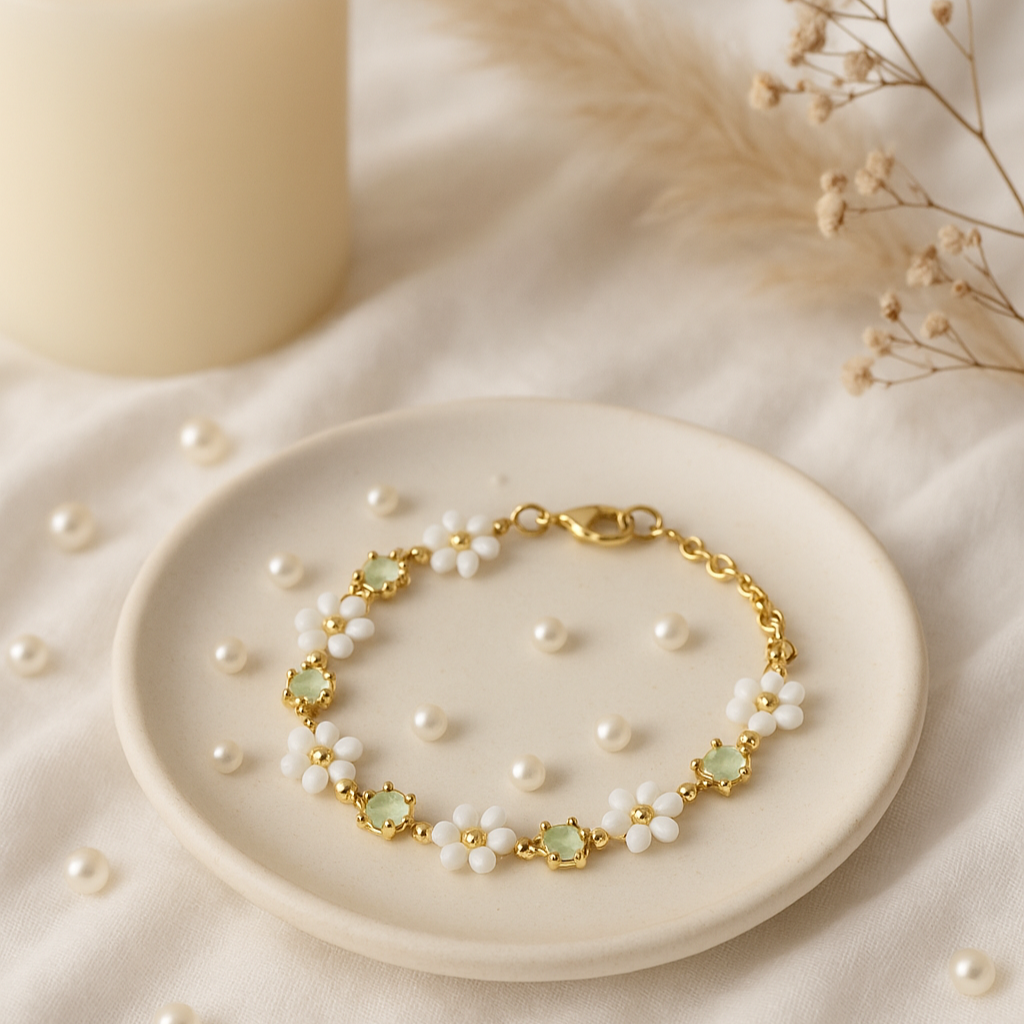 Das "Flora" Armband fertige ich in Handarbeit aus goldfarbenen Elementen und dezenten Perlendetails in Weiß und Grün.